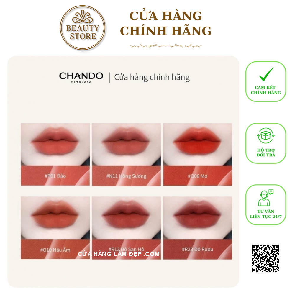 Son Kem Lì CHANDO Himalaya Velvet Lip Cream là dòng son nổi bật đến từ thương hiệu CHANDO – một trong những thương hiệu mỹ phẩm hàng đầu Trung Quốc, nổi tiếng với các sản phẩm lấy cảm hứng từ thiên nhiên vùng núi Himalaya. Với kết cấu kem lì mịn như nhung, son mang đến lớp màu chuẩn sắc, bám lâu nhưng vẫn giữ được độ mềm mượt và nhẹ môi suốt nhiều giờ.