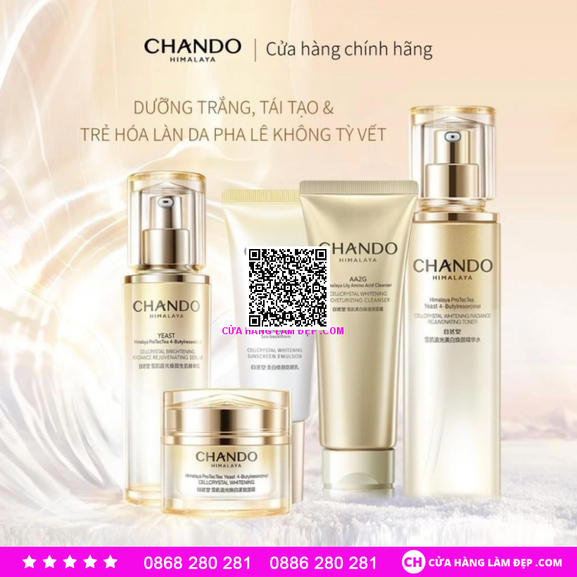 Sữa Rửa Mặt CellCrystal CHANDO Himalaya là sản phẩm làm sạch da chuyên sâu đến từ thương hiệu CHANDO Himalaya – nổi tiếng với các dòng mỹ phẩm ứng dụng công nghệ sinh học kết hợp chiết xuất từ thiên nhiên vùng núi tuyết. Với công thức dịu nhẹ chứa Tranexamic Acid và Niacinamide, sản phẩm không chỉ giúp làm sạch da mà còn hỗ trợ dưỡng trắng, cải thiện sắc tố và phục hồi làn da lão hoá.