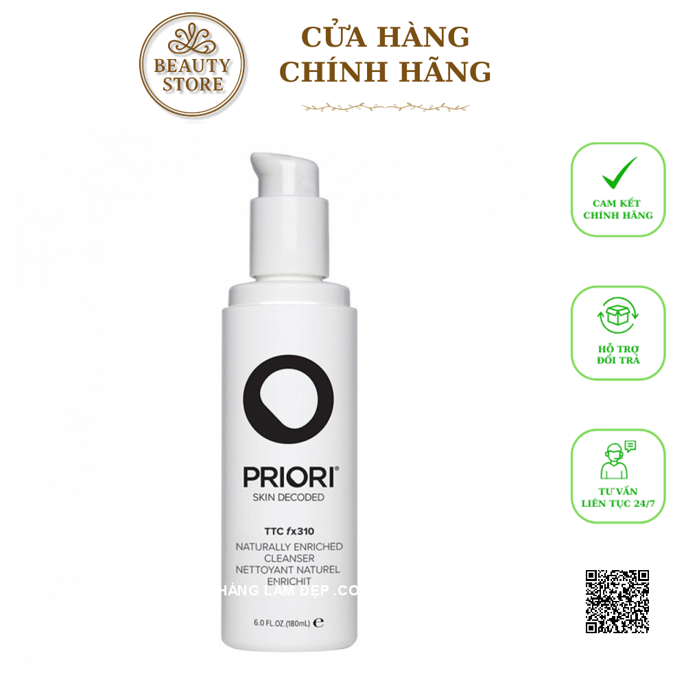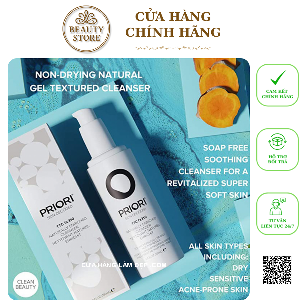 Priori TTC fx310 Naturally Enriched Cleanser là sữa rửa mặt với ba tính năng làm sạch, làm dịu và dưỡng sáng cho da.Sữa rửa mặt với kết cấu dạng gel, không chứa xà phòng, dịu nhẹ không làm khô da hoàn hảo để sử dụng hàng ngày. Được kết hợp từ phức hợp Triple Turmeric Complex có tác dụng dưỡng ẩm tự nhiên, làm sáng và tẩy Tinh chất chết cho da, kể cả da khô, nhạy cảm và bị mụn. Sản phẩm sẽ giúp cân bằng độ pH, chứa nhiều chất hỗ trợ Hỗ Trợ Chống oxy hóa để giữ cho hàng rào bảo vệ da của bạn hỗ trợ Hỗ Trợ Chống lại các tác nhân gây hại từ bên ngoài, vì vậy sau mỗi lần sử dụng,da bạn sẽ cảm giác sạch, thông thoáng và ngậm nước