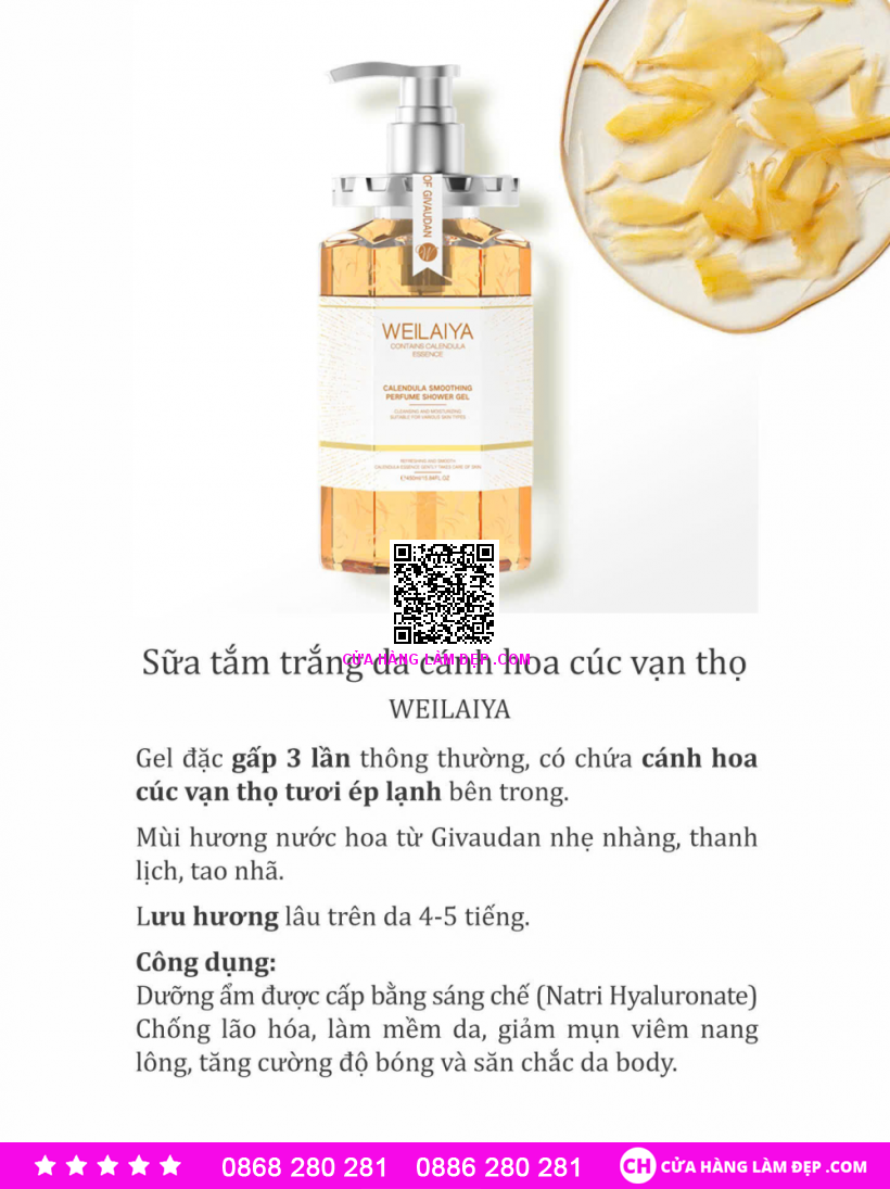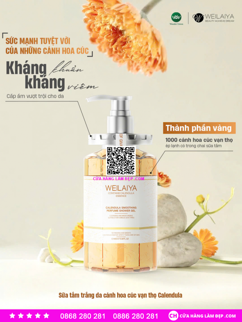 Công dụng Sữa Tắm Trắng Da Cánh Hoa Cúc Vạn Thọ Wailaiya Calendula Smoothing Perfume Shower Gel: