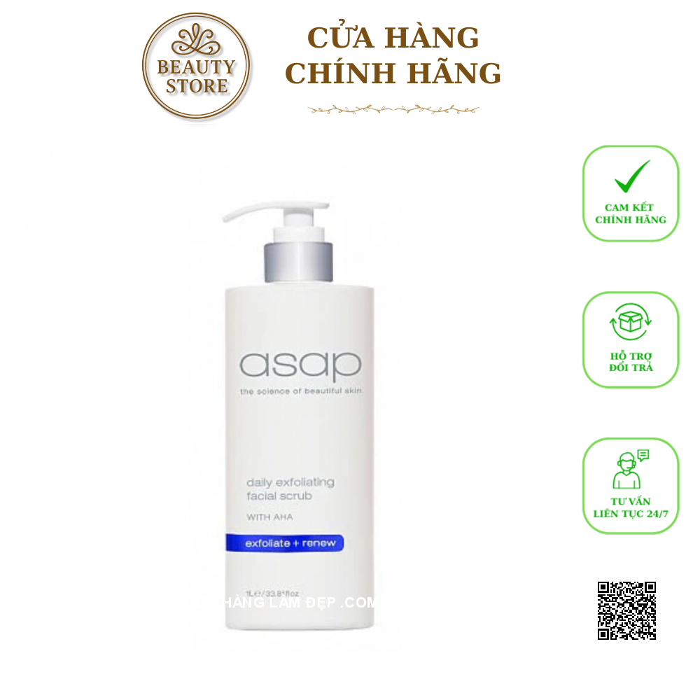 Asap Daily Exfoliating Facial Scrub tẩy da chết tác động kép độc đáo kết hợp chất tẩy Tinh chất chết vật lý và hóa học. Giúp loại bỏ triệt để Tinh chất chết, cặn bẩn và tác nhân làm bít lỗ chân lông. Đồng thời, kích thích collagen và tái tạo Tinh chất, cho da cảm giác tươi mới, mềm mại rạng rỡ hơn mỗi ngày. Đặc biệt, các hạt phân hủy sinh học có trong sản phẩm siêu nhỏ mịn, không làm hỗ trợ trẻ hóa tuyến dầu và cũng không gây tổn thương da dù sử dụng hằng ngày.