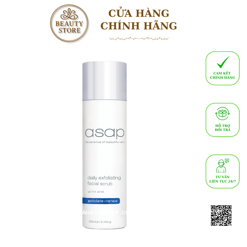 Asap Daily Exfoliating Facial Scrub tẩy da chết tác động kép độc đáo kết hợp chất tẩy Tinh chất chết vật lý và hóa học. Giúp loại bỏ triệt để Tinh chất chết, cặn bẩn và tác nhân làm bít lỗ chân lông. Đồng thời, kích thích collagen và tái tạo Tinh chất, cho da cảm giác tươi mới, mềm mại rạng rỡ hơn mỗi ngày. Đặc biệt, các hạt phân hủy sinh học có trong sản phẩm siêu nhỏ mịn, không làm hỗ trợ trẻ hóa tuyến dầu và cũng không gây tổn thương da dù sử dụng hằng ngày.