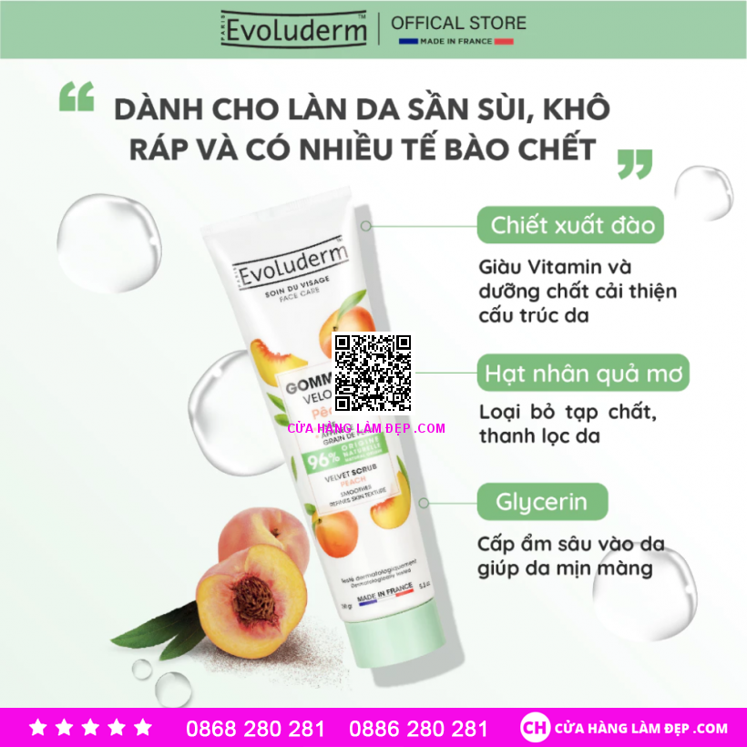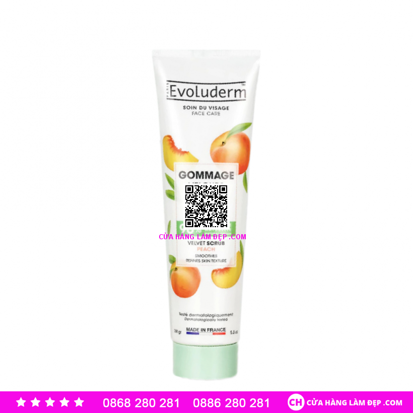 Tại hệ thống Cửa Hàng Làm Đẹp, sản phẩm Evoluderm Tẩy Tinh chất Chết Mềm Mịn Da Mặt Chiết Xuất Đào 150g từ Pháp có giá 195.000 VNĐ
