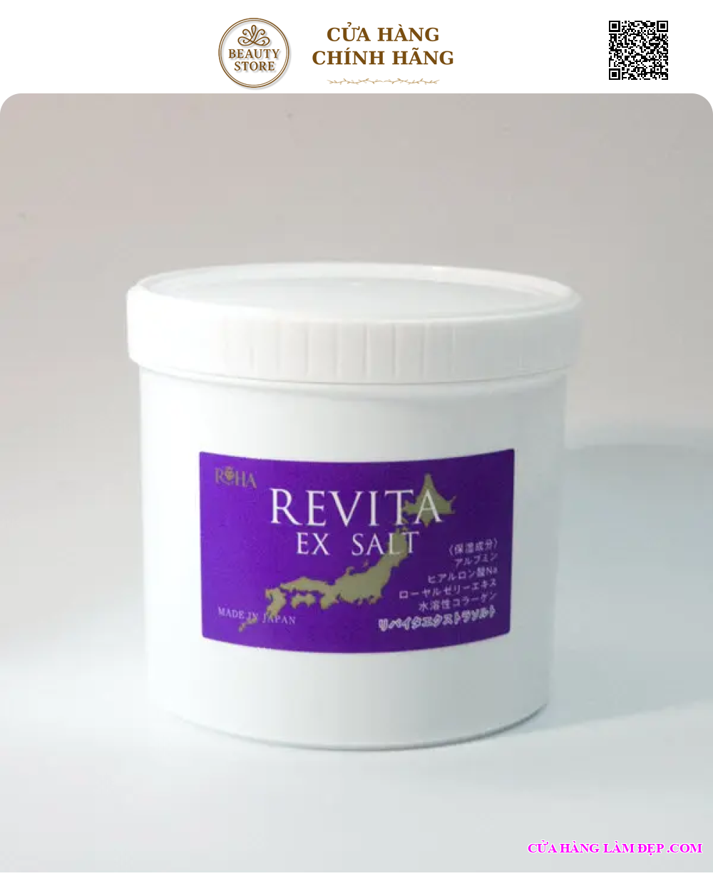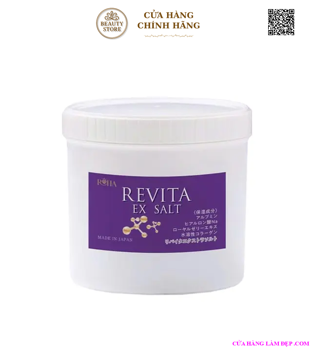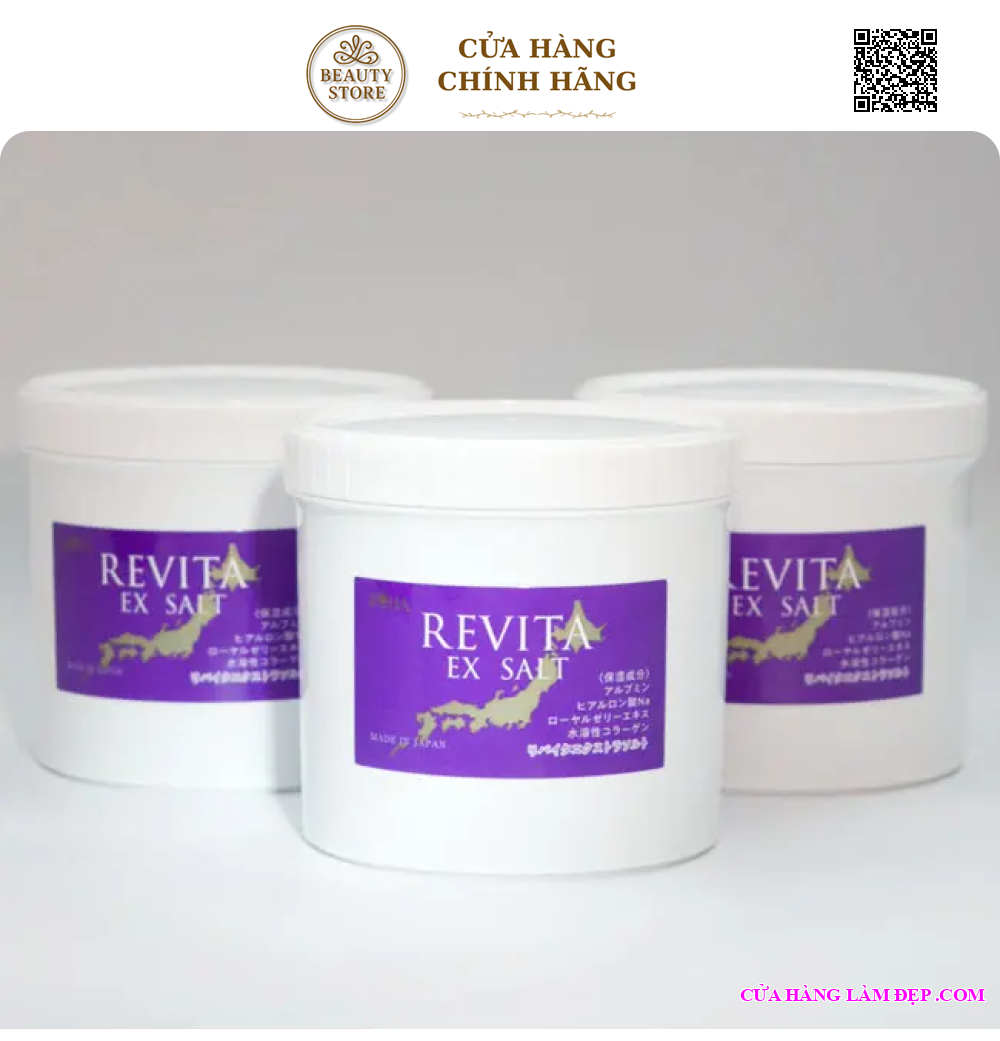 Tẩy tế bào chết muối tảo biển Revita Ex Salt là sản phẩm chăm sóc da cao cấp đến từ Nhật Bản, được sử dụng phổ biến tại nhiều spa và clinic. Với sự kết hợp giữa muối biển giàu khoáng chất, tảo biển, collagen, mật ong và nhiều chiết xuất thực vật, sản phẩm giúp loại bỏ tế bào chết, làm sạch sâu lỗ chân lông, đồng thời cấp ẩm và phục hồi độ đàn hồi cho da. Sau khi sử dụng, da trở nên mềm mại, sáng mịn và săn chắc như vừa được chăm sóc tại spa.