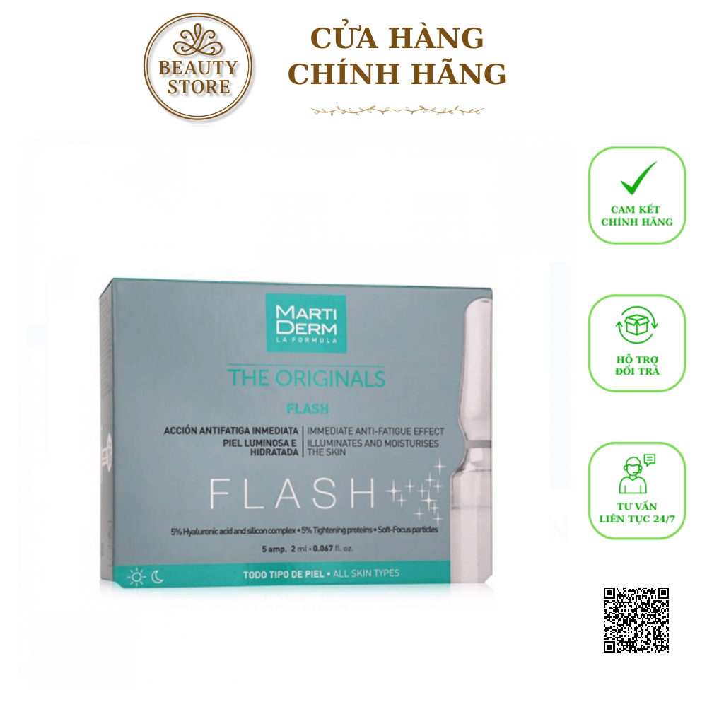 MartiDerm The Originals Flash là tinh chất cô đặc (ampoule) với công thức hỗ trợ Hỗ Trợ Chống mệt mỏi tức thì cho làn da, giúp che giấu các khuyết điểm như nếp nhăn, mụn và tình trạng da xỉn màu thiếu sức sống, mang lại cho bạn một làn da rạng rỡ & tươi sáng ngay sau khi sử dụng.