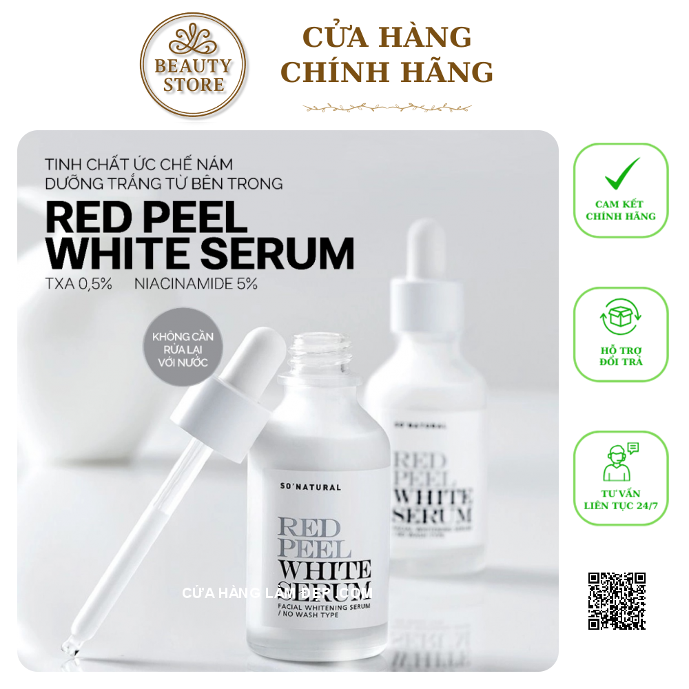 Tinh Chất Dưỡng Trắng, Ức Chế Nám So'Natural Red Peel White Serum giúp làm sáng làn da xỉn màu, phục hồi da và cải thiện tone da, hỗ trợ Hỗ Trợ Chống oxy hoá mạnh mẽ, bảo vệ da khỏi các tác động của môi trường. Kết hợp với các hoạt chất có tính năng dưỡng trắng khác trong sản phẩm giúp tăng hiệu quả Mờ Nám, cải thiện làn da thô ráp, xỉn màu, cải thiện hàng rào bảo vệ da.