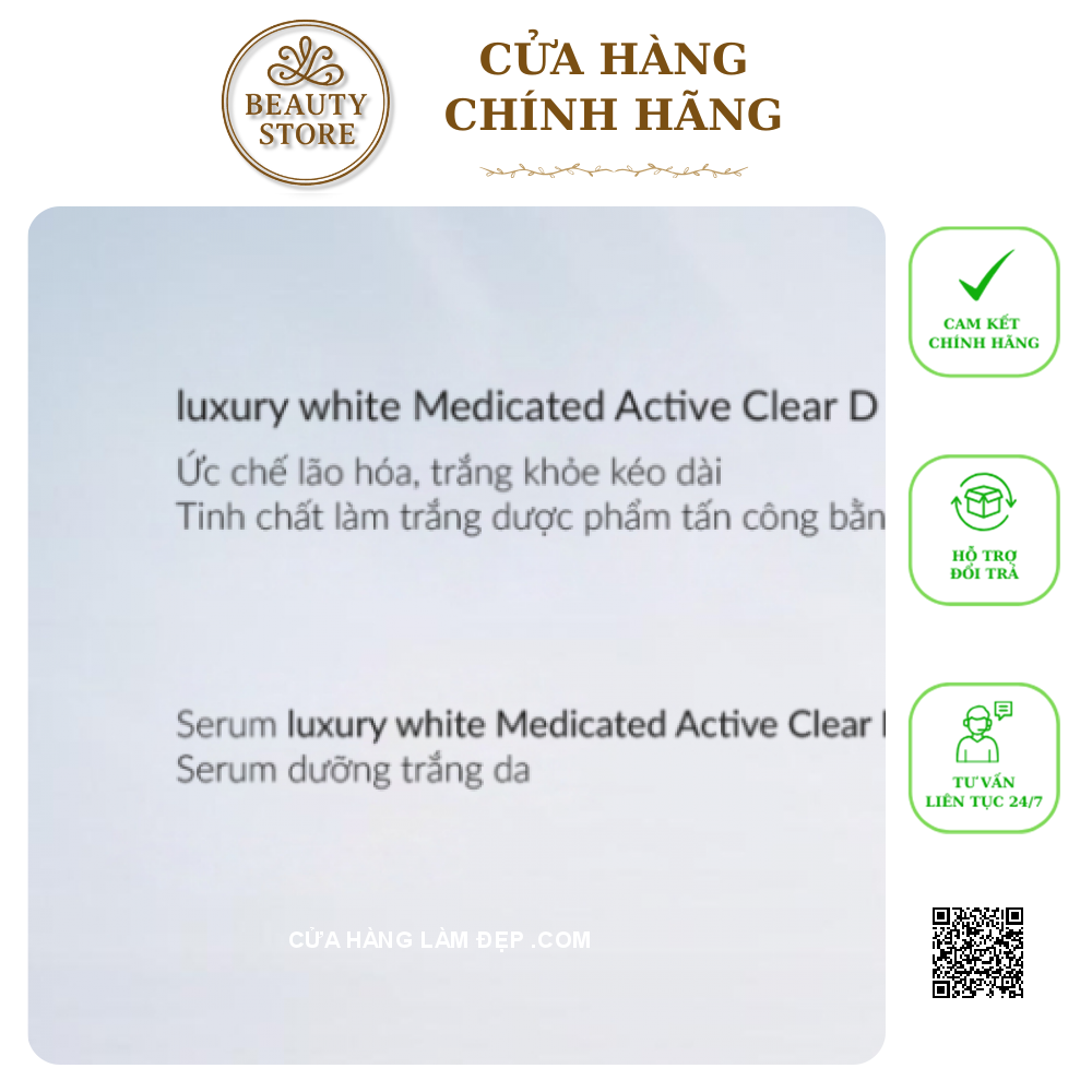 Tình trạng viêm yếu do các tác nhân kích thích như căng thẳng, mất cân bằng nội tiết tố, vi khuẩn và ma sát sẽ khiến làn da thô ráp, kích hoạt sản xuất melanin cùng với tác hại của tia cực tím. “Luxury White Medicinal Active Clear D” được phát triển từ góc độ làm trắng, chứa axit tranexamic, vitamin C và hydroquinone chiết xuất giúp ngăn chặn quá trình sản sinh melanin. Tinh chất có kết cấu gel đặc và ẩm giúp mang lại làn da trắng sáng.