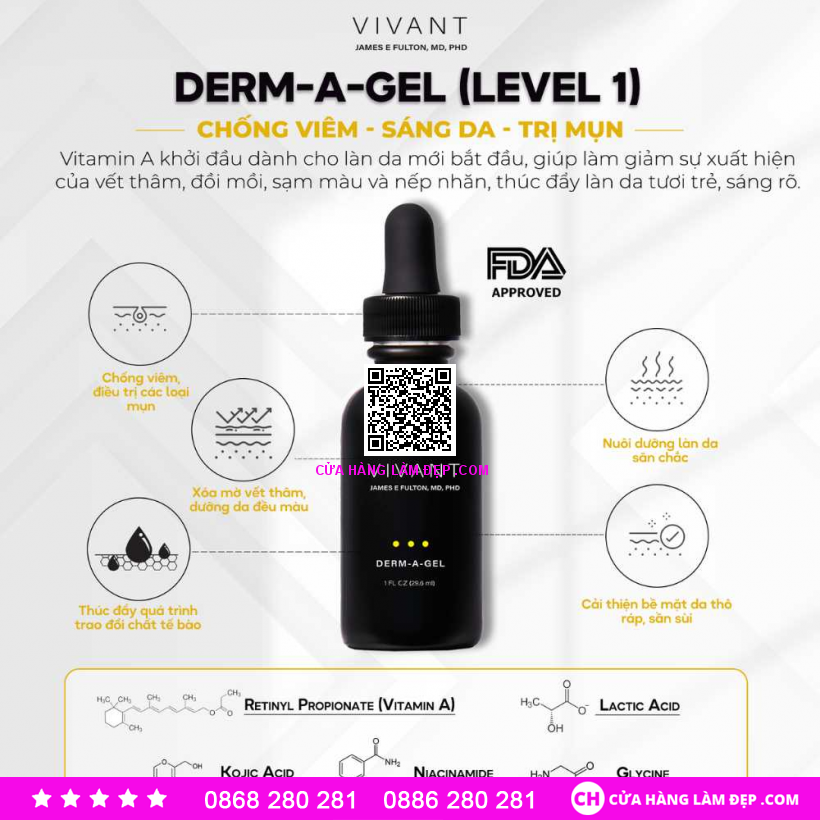 Derm-A Gel – Tinh chất Vitamin A Propionate dịu nhẹ được cấp bằng sáng chế có tác dụng thúc đẩy quá trình trao đổi chất Tinh chất, giảm nhăn, xóa mờ vết thâm, đồng thời nuôi dưỡng da hiệu quả nhằm ngăn ngừa dấu hiệu lão hóa