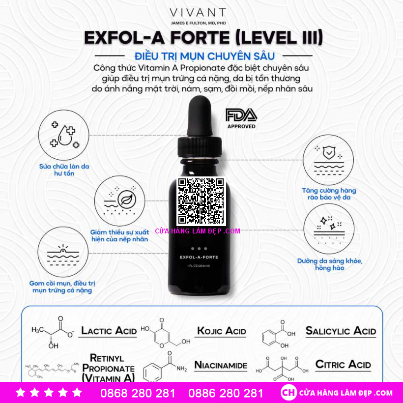 Exfol-A Forte – Giải pháp tái tạo da chuyên sâu nhất trong các liệu pháp Vitamin A được cấp bằng sáng chế của Vivant Skincare, kết hợp AHA mang đến kết quả tẩy Tinh chất chết vượt trội và điều Giảm Mụn trứng cá mạnh mẽ.
