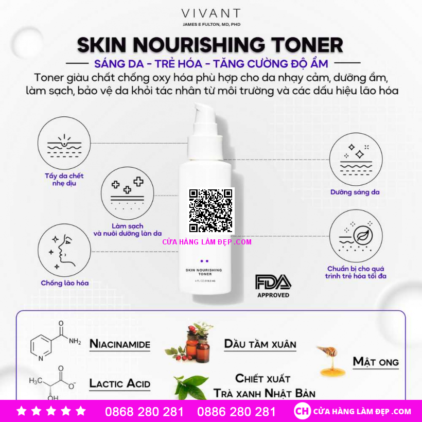 Skin Nourishing Toner – Nước cân bằng giàu chất hỗ trợ ngừa oxy hóa và Mandelic Acid giúp làm sạch sâu lỗ chân lông, ngăn ngừa hình thành mụn trứng cá và bảo vệ da hỗ trợ ngừa lại các tác nhân gây hại từ môi trường