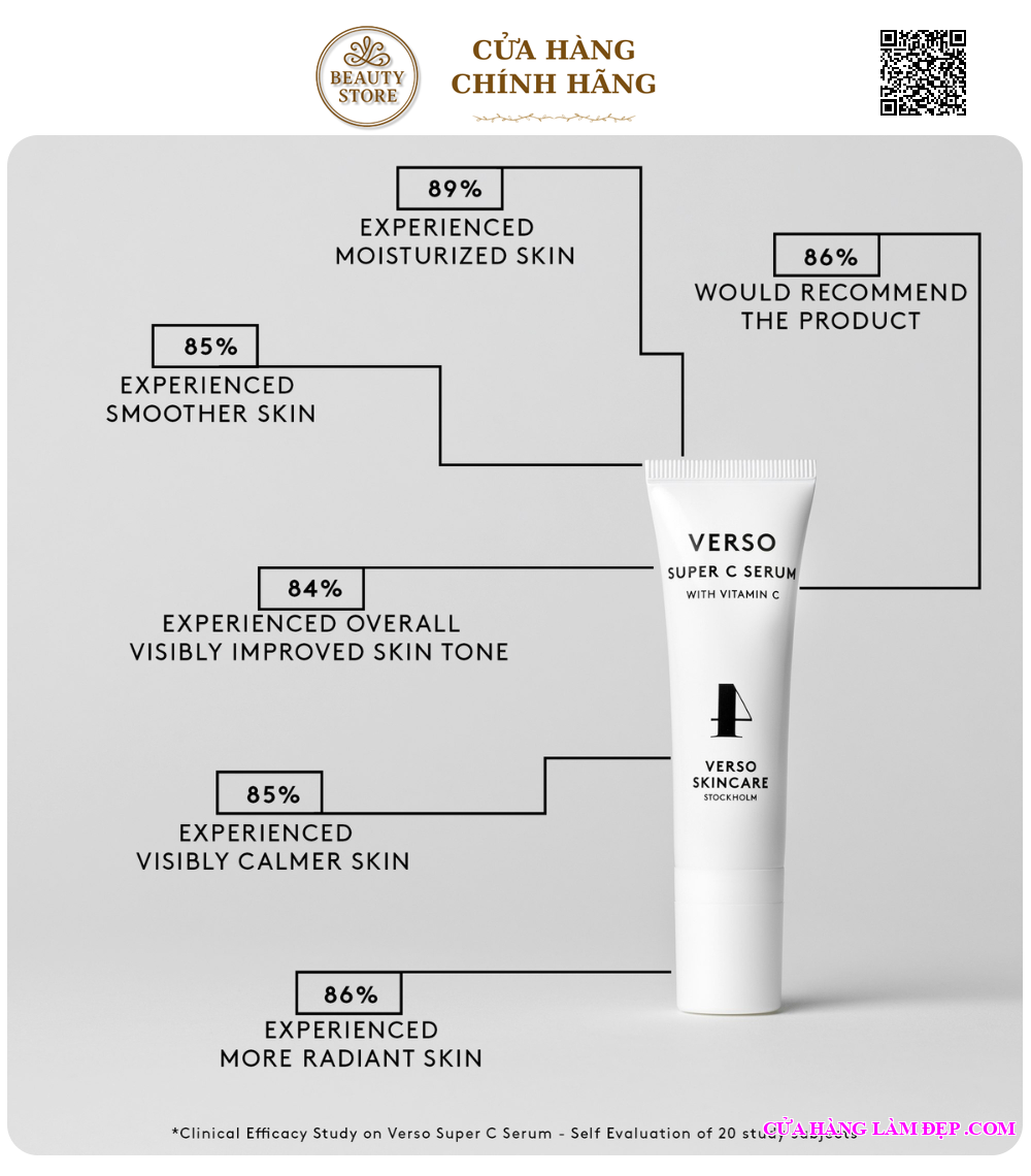 Với công thức Vitamin C ổn định, dịu nhẹ nhưng hiệu quả cao, Verso Super C Serum không chỉ mang lại hiệu quả làm sáng da mà còn hỗ trợ trẻ hóa làn da và cải thiện kết cấu da. Đặc biệt, serum có khả năng kết hợp hoàn hảo với Vitamin A như Retinol 8 và NEAR 1, giúp tăng cường hiệu quả chăm sóc da tổng thể.