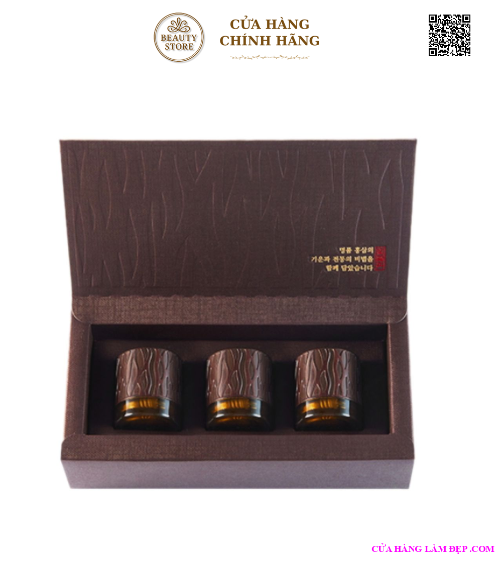 "Chứa sức mạnh từ truyền thuyết trăm năm." Viên Hồng Sâm Linh Đan Hwangjindan là những viên quý dành cho Hoàng Đế, được đặt trong hộp gỗ sang trọng, kiểu dáng giao thoa giữa nét truyền thống và hiện đại. Mỗi viên “đan” được đặt riêng biệt trong 1 hộp trụ tròn. Thân hộp chạm khắc các họa tiết nổi xen kẽ nhau giúp cố định các viên đan ở đúng vị trí, tránh tình trạng móp, méo khi di chuyển.