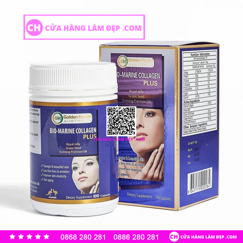 - Viên Uống Đẹp Da Bio Marine Collagen Plus Golden Health (100 Viên) là sản phẩm của Golden Health - một hãng thực phẩm chức năng nổi tiếng của Úc. Sản phẩm được tạo thành từ tinh chất collagen biển, chiết xuất sữa ong chúa, tinh dầu hạt nho, tinh dầu hoa anh thảo, protein và các thành phần vitamin quan trọng khác. Viên collagen Bio-Marine mang đến cho người dùng một sức khỏe sung mãn và một làn da đẹp tự nhiên.