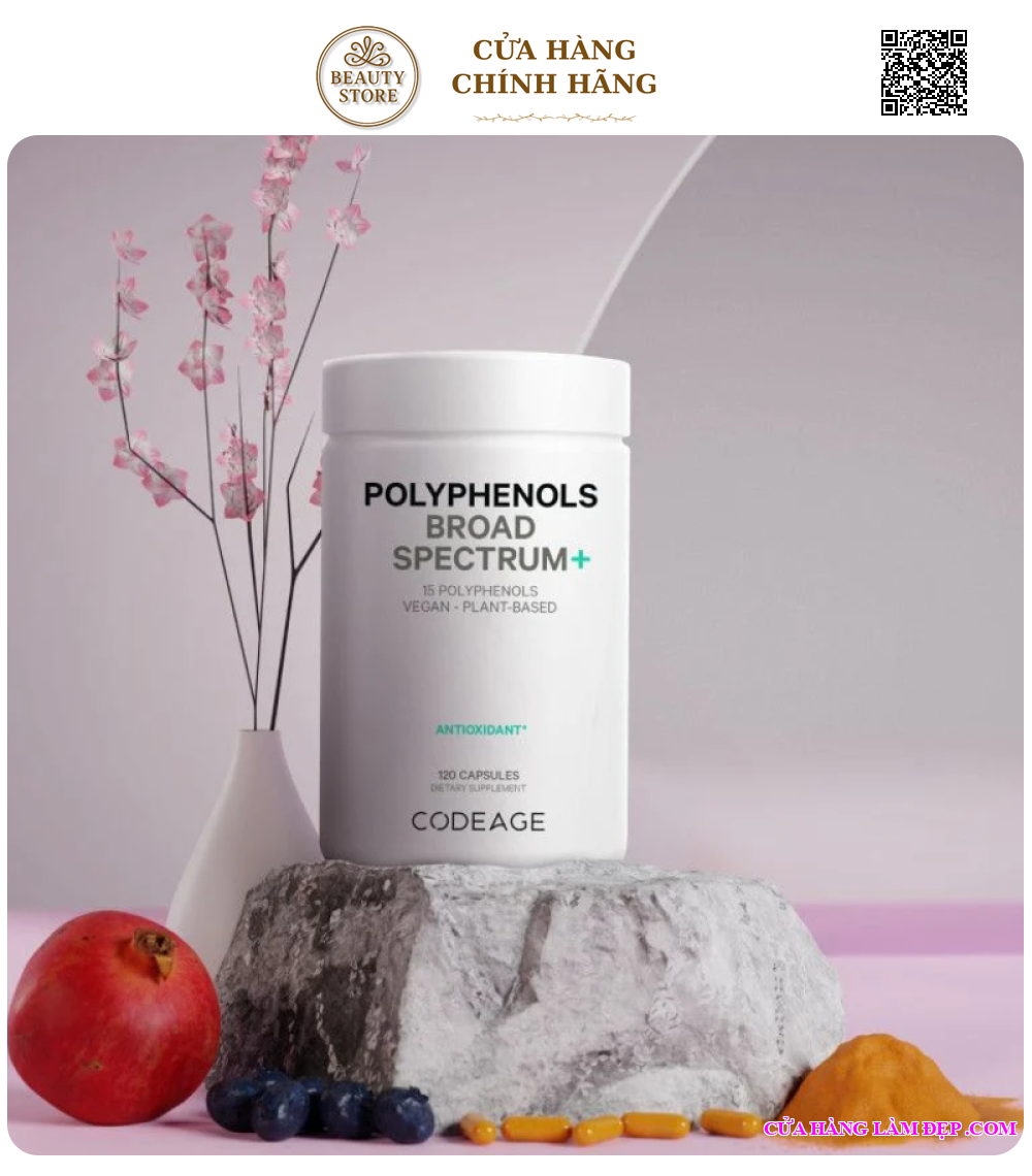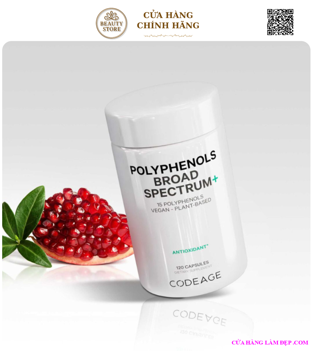 Polyphenols Broad Spectrum là thực phẩm bảo vệ sức khỏe cao cấp của thương hiệu Codeage (Mỹ), với công thức chứa đến 15 loại polyphenol từ thực vật và trái cây tự nhiên, hỗ trợ chống oxy hóa mạnh mẽ, bảo vệ da khỏi tác động của ánh nắng mặt trời và cải thiện sắc tố da từ bên trong.