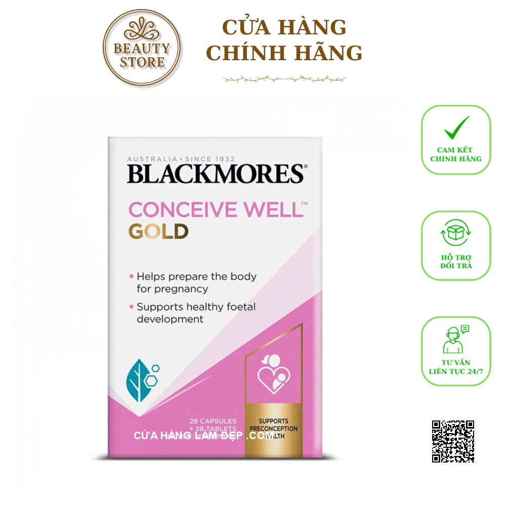 - Ngày nay do áp lực công việc, ô nhiễm môi trường và thực phẩm bẩn,... khiến sức khoẻ phụ nữ bị thuyên giảm vì vậy khả năng thụ thai cũng sẽ giảm sút. Vì vậy việc bổ sung vitamin và các loại khoáng thiết yếu tốt cho sức khoẻ sinh sản của phụ nữ là điều vô cùng cần thiết. - Viên Uống Hỗ Trợ Thụ Thai Blackmores Conceive Well Gold là vitamin đến từ thương hiệu Blackmores dành riêng cho phụ nữ đang lên kế hoạch thụ thai giúp bổ sung vitamin và các dưỡng chất thiết yếu cho phụ nữ trước giai đoạn mang thai, hỗ trợ khả năng thụ thai cho phụ nữ. Đồng thời giúp họ có sự chuẩn bị kĩ càng hơn cho quá trình thụ thai đầy đủ dưỡng chất và khoẻ mạnh, hỗ trợ sự phát triển lành mạnh của thai nhi trong suốt thai kỳ.