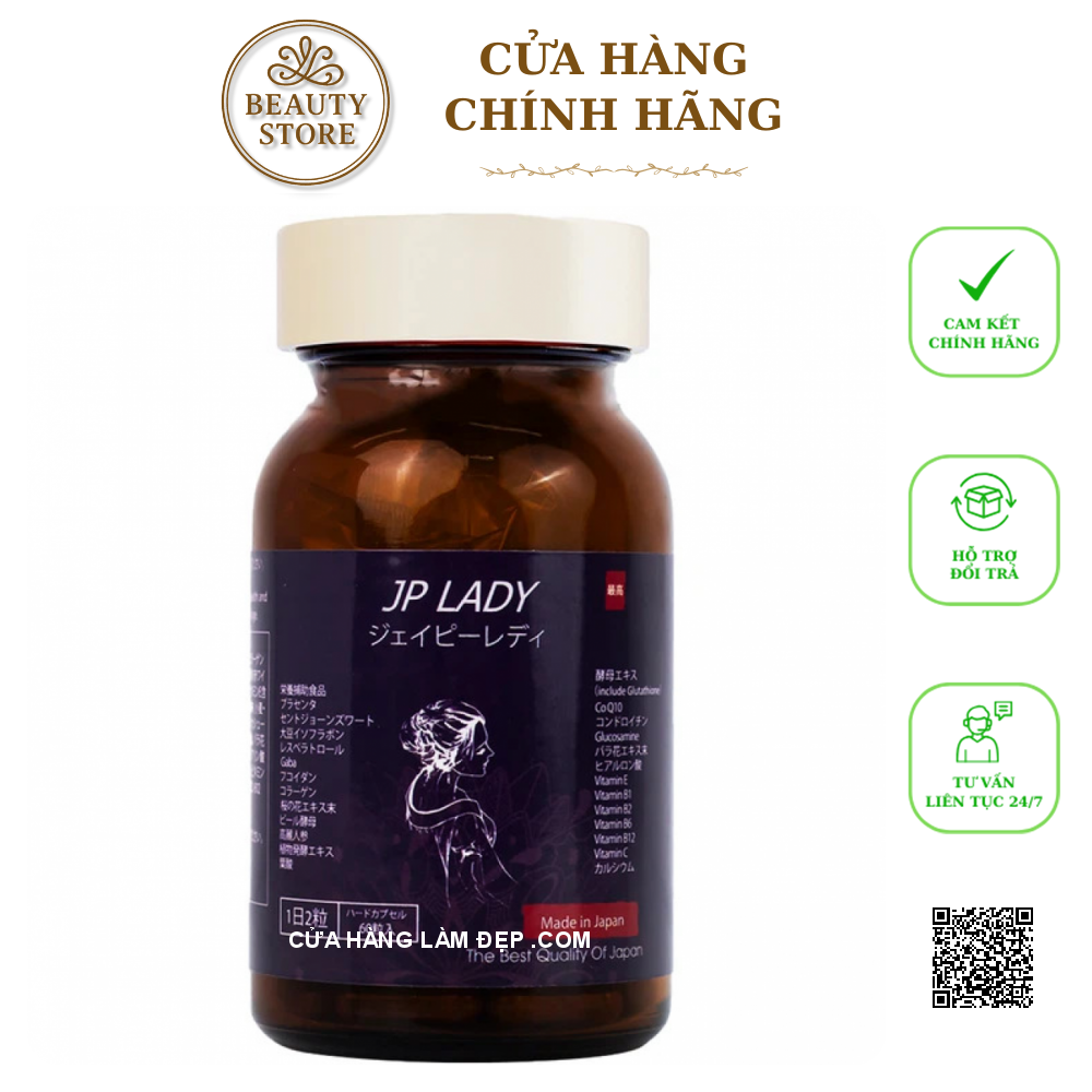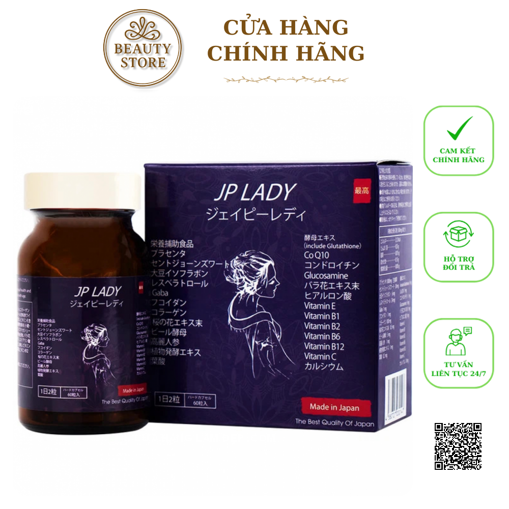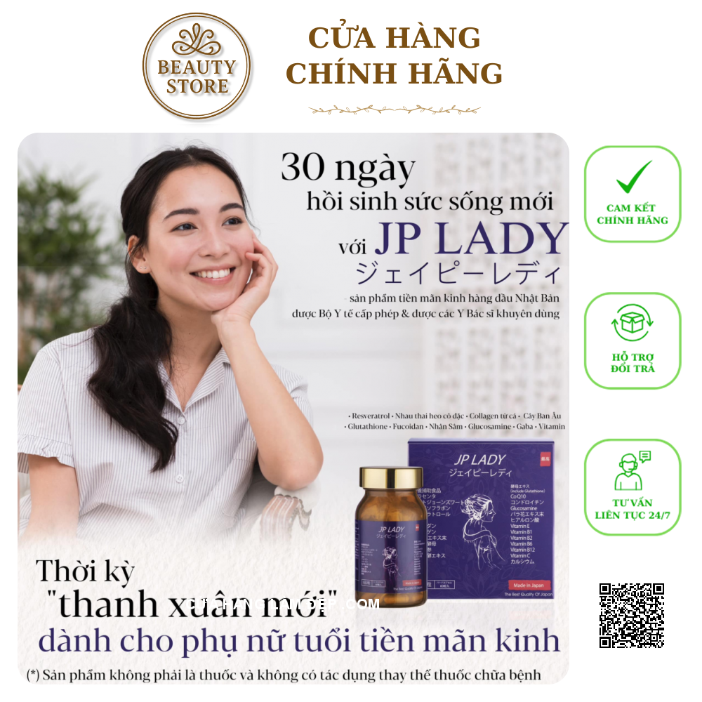 JP Lady là viên uống được bào chế từ chiết xuất heo, collagen cùng các loại vitamin và khoáng chất cần thiết giúp nâng cao sức khỏe cho phụ nữ trong thời kỳ tiền mãn kinh, giảm bớt nỗi lo tiền mãn kinh, tự tin giao tiếp và hạnh phúc viên mãn trong cuộc sống. Sản phẩm được nhập khẩu trực tiếp từ Nhật Bản.