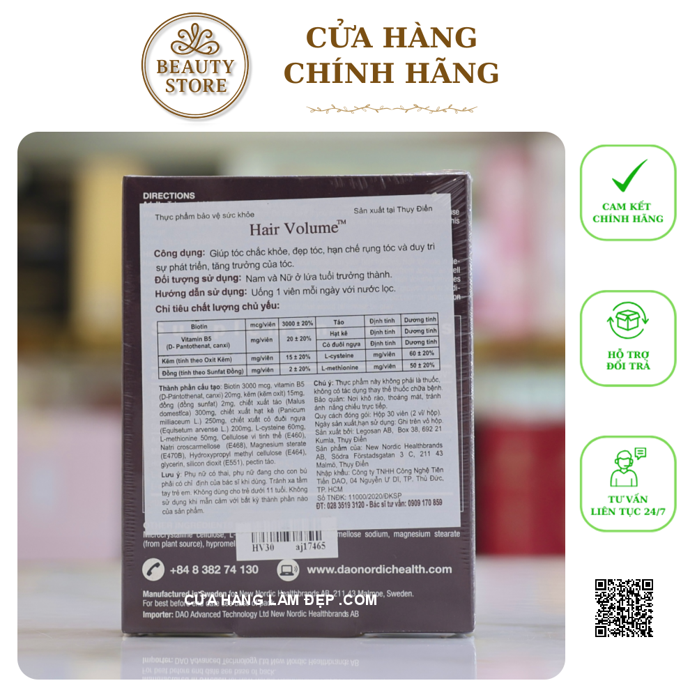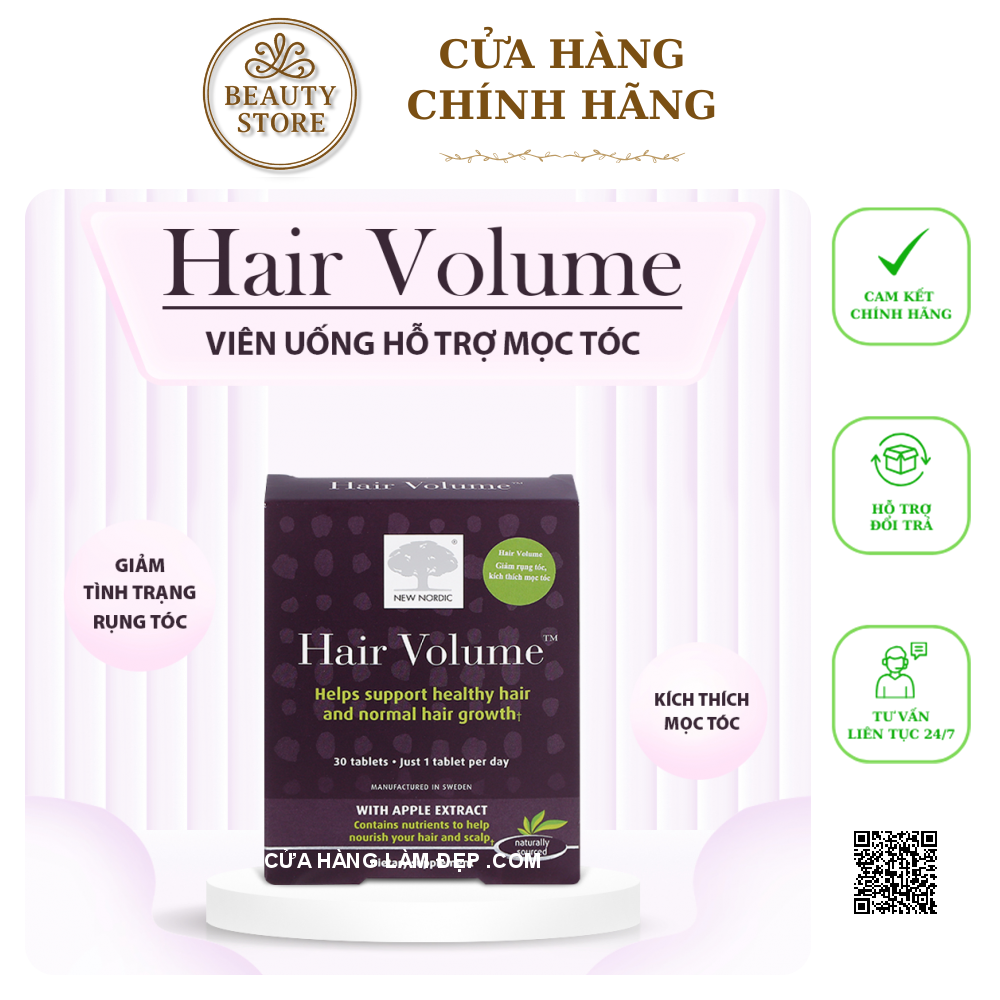 -Viên uống dưỡng tóc Hair Volume là sản phẩm chất lượng đến từ Thụy Điển, giúp phục hồi nang tóc theo cơ chế làm giảm nồng độ DHT trong máu giúp hỗ trợ ngừa rụng tóc tối đa. Bên cạnh đó, sản phẩm còn cung cấp lượng chất dinh dưỡng lớn giúp phục hồi, nuôi dưỡng tóc từ gốc đến ngọn phát triển dày, dài và chắc khỏe hơn.