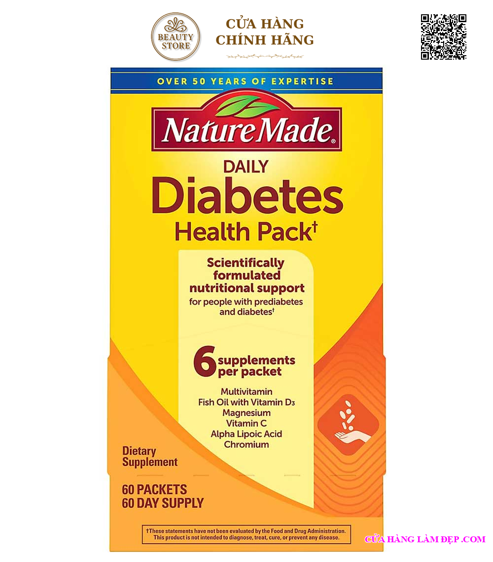 Diabetes nature made là thực phẩm bổ sung, cung cấp các vitamin và khoáng chất thiết yếu để hỗ trợ dinh dưỡng hàng ngày cho người bị tiền tiểu đường và tiểu đường. Chế phẩm này có xuất xứ tại Mỹ, do Pharmavite sản xuất, mang thương hiệu Nature Made. Được hỗ trợ bởi khoa học và cam kết về chất lượng, Nature Made đã trở thành thương hiệu hàng đầu trong danh mục Vitamin, Khoáng chất và Thực phẩm bổ sung trong việc cung cấp dinh dưỡng chất lượng cao cho mọi người.