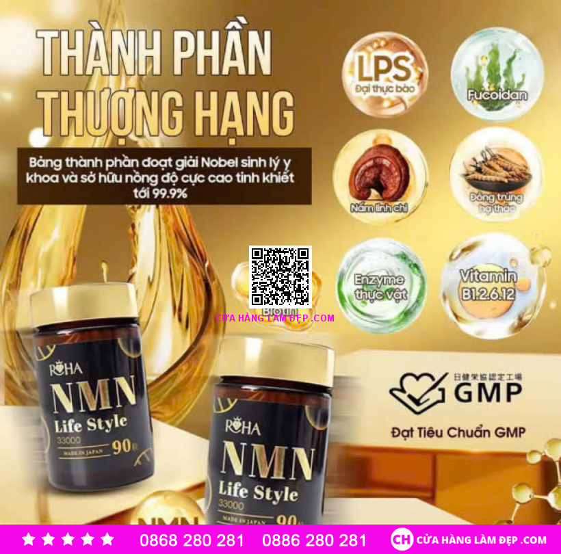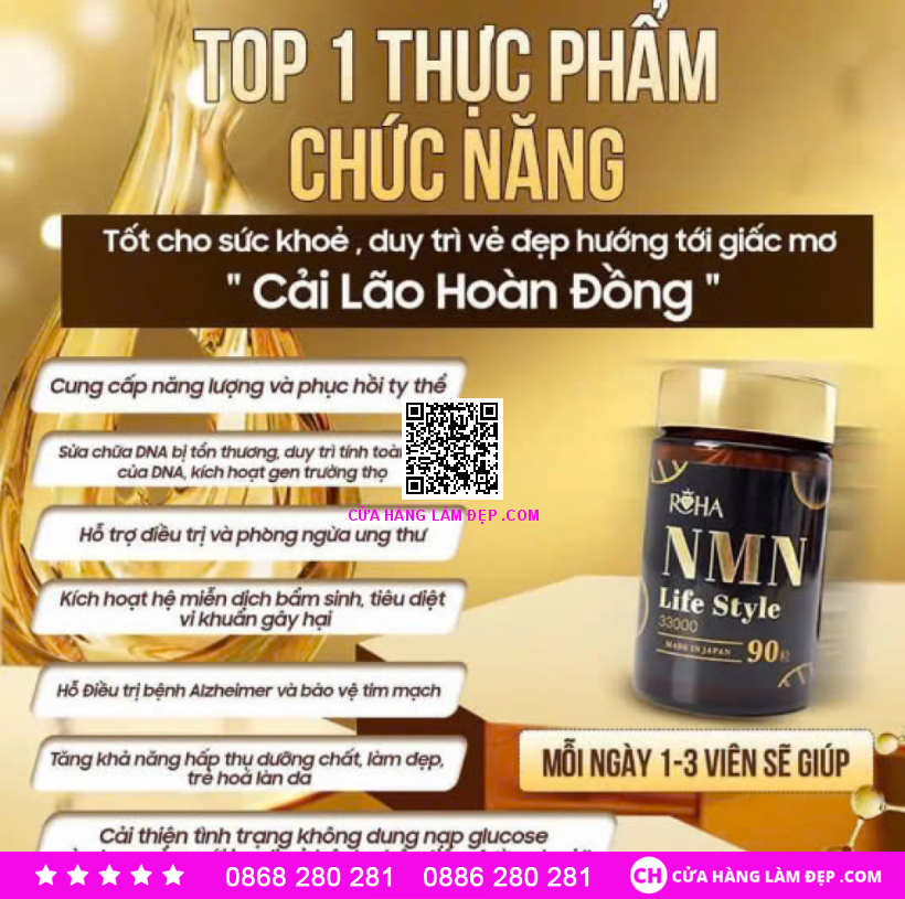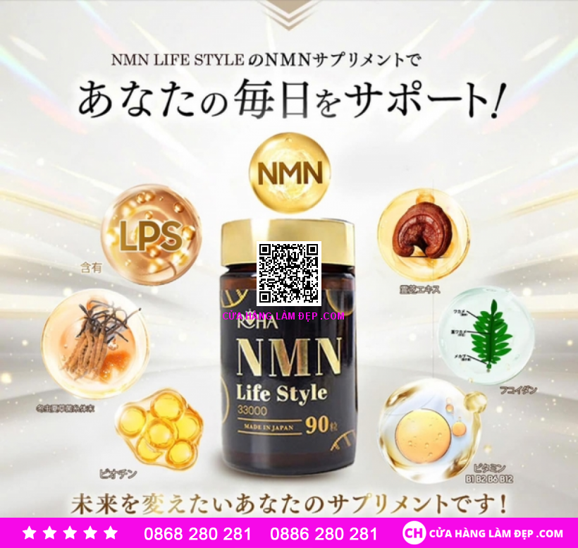 Viên Uống NMN Life Style 33000 Nhật Bản với hàm lượng NMN cực cao 800mg/1 ngày, kết hợp cùng các hoạt chất quý như LPS đại thực bào, FCD, Biotin, nấm linh chi, đông trùng hạ thảo, Enzyme thực vật, L-Arg, L-Citrulline, canxi,… với khả năng thẩm thấu nhanh vào cơ thể, sản phẩm đột phá mang đến sự thay đổi toàn diện từ trong ra ngoài, cung cấp năng lượng và giúp phục hồi ty thể, hỗ trợ ngăn ngừa u.ng thư, với khả năng tái tạo tăng sinh Tinh chất Đẹp Da sinh học giúp duy trì tuổi xuân, ngăn ngừa lão hóa, làm đẹp da, từ đó giúp bạn sở hữu chìa khóa vàng “trẻ lâu – khỏe lâu” của người Nhật.