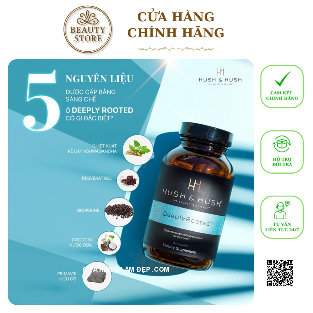 - Viên uống Hush And Hush DeeplyRooted có khả năng điều tiết nội tiết tố, bổ sung dưỡng chất cần thiết cho nang tóc phát triển. Sau hành trình nghiên cứu hơn 10 năm, các chuyên gia của Hush tìm ra các hoạt chất có khả năng ức chế một số điều kiện bất lợi trong quá trình mọc tóc.