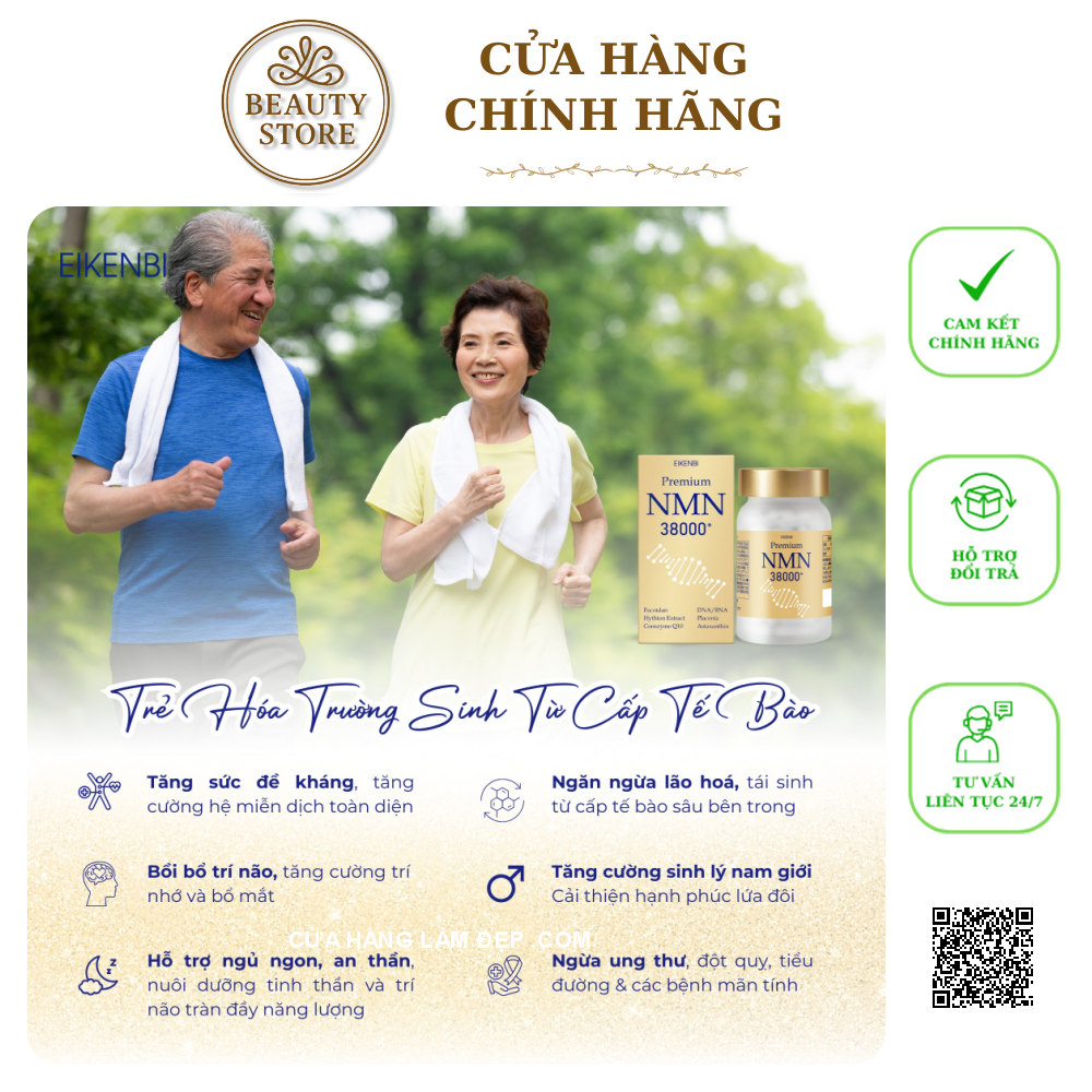 NMN 38000+ EIKENBI chứa lượng NMN lên đến 38000+ với độ tinh khiết 100% giúp nuôi dưỡng Tinh chất già yếu trở nên khỏe mạnh, tái tạo việc phát triển các Tinh chất mới giúp đảo ngược quá trình lão hoá, kéo dài tuổi thọ một cách hiệu quả mà chưa có dòng sản phẩm nào làm tốt được. Đây chính là bí quyết giúp trẻ lâu, sống thọ, làn da rạng rỡ bất chấp tuổi tác của người Nhật.
